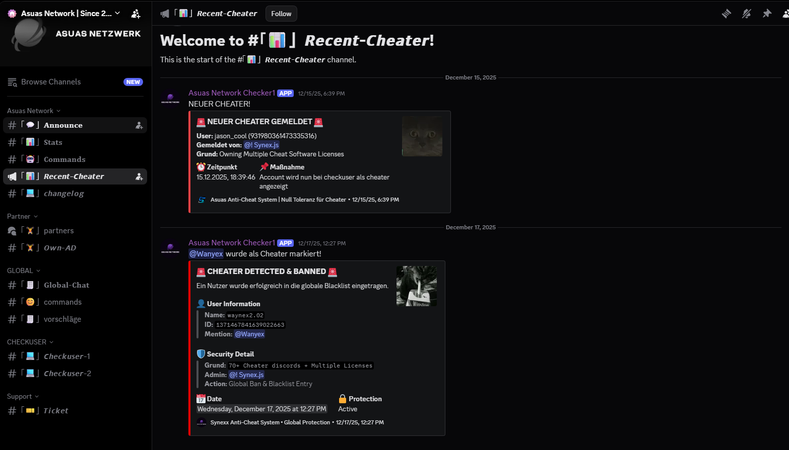 /check, /report, /stats - Alle wichtigen Befehle direkt in deinem Discord Server verfügbar. Schnelle Überprüfung verdächtiger Spieler in Echtzeit mit detaillierten Reports und Historie.
